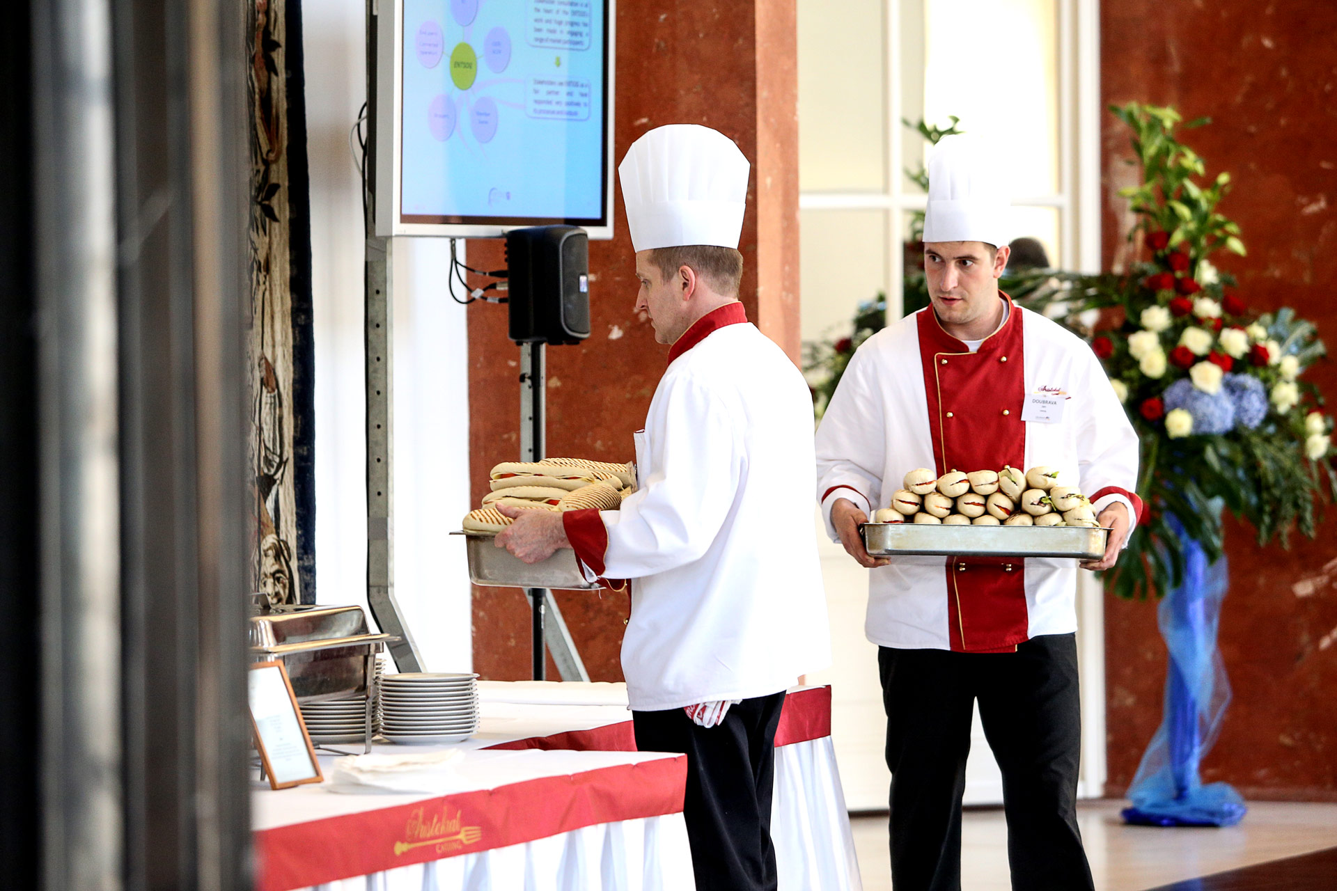 These are social gatherings of professionals from various fields of health care, industry, agriculture and business. Although gastronomy is to play rather a marginal role here, its level determines the delegate concentration for a discussed topic. Drinks, salt and sweet snacks and also hot lunches in most cases are served to the guests throughout the day. Prior to the beginning or at the conference end, there is usually a common supper. Casual formal dress is the suitable wear. This applies to the supper, then wear according to the event’s nature (banquet, reception).